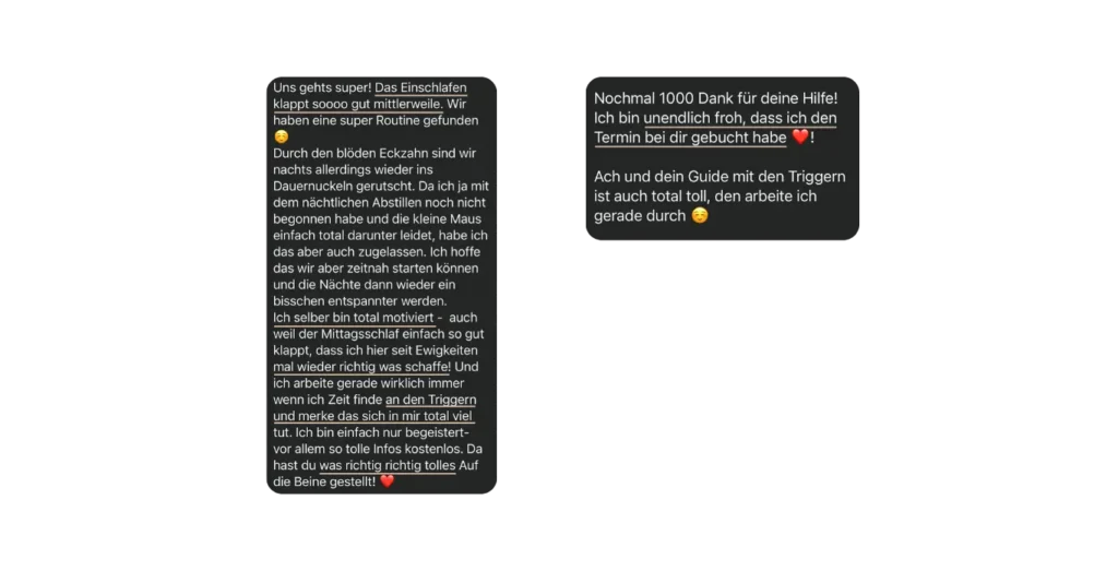 Du bekommst fundiertes Wissen zur Schlafentwicklung, konkrete Strategien für eure Tage & Nächte und einen klaren Plan für eure individuelle Situation. Für mehr Sicherheit, weniger Zweifel und entspanntere Nächte.